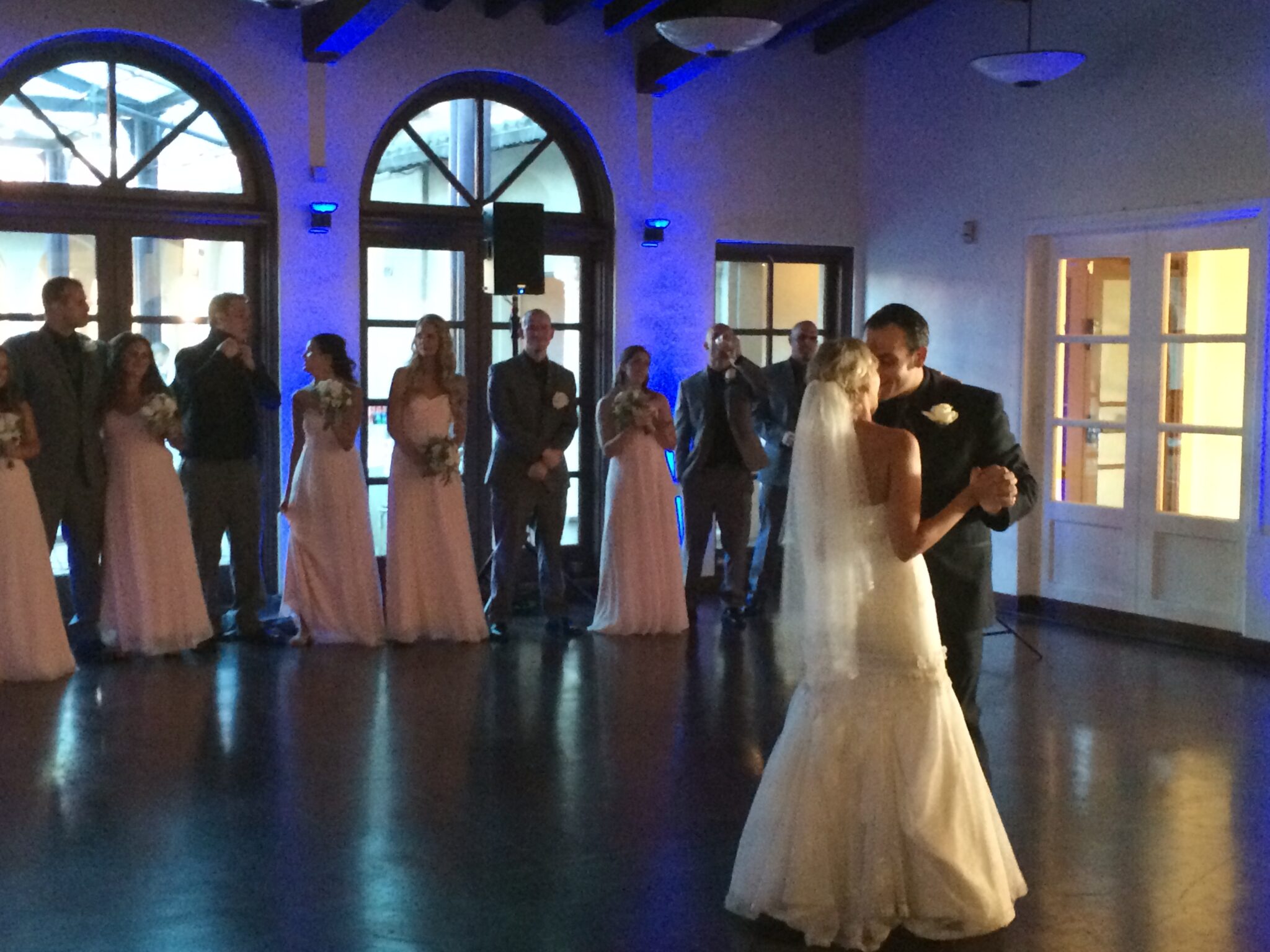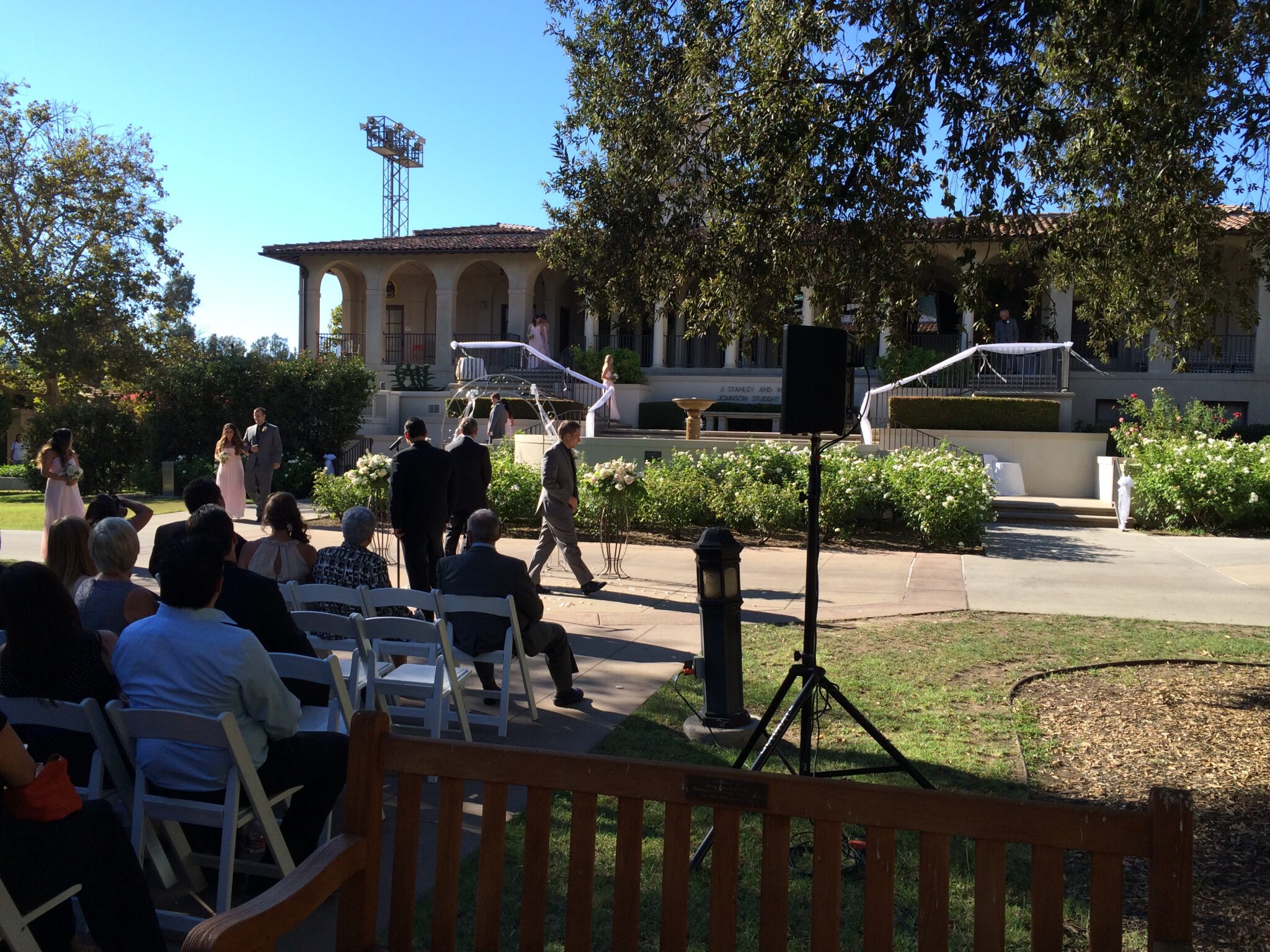 I was thrilled to be asked to MC/DJ my cousin Danny’s wedding this past Saturday. It was held at Occidental College in Los Angeles. The wedding ceremony took place in the quad outside the dining hall, and it was beautiful. Watching the bridal party descend the giant staircase behind the wedding arch was magical. After the ceremony, everyone proceeded to the terrace for a fun cocktail hour then into the dining hall for the reception.